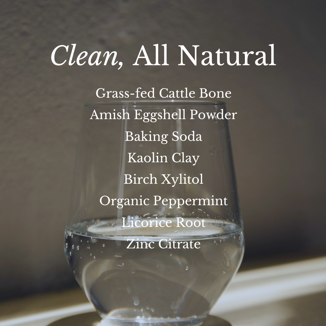 Ingredients: Grass-fed cattle Bone, Flouride Free Amish Eggshell Powder, Baking Soda, Kaolin Clay, Birch Xylitol, Organic Peppermint, Licorice Root, Zinc Citrate